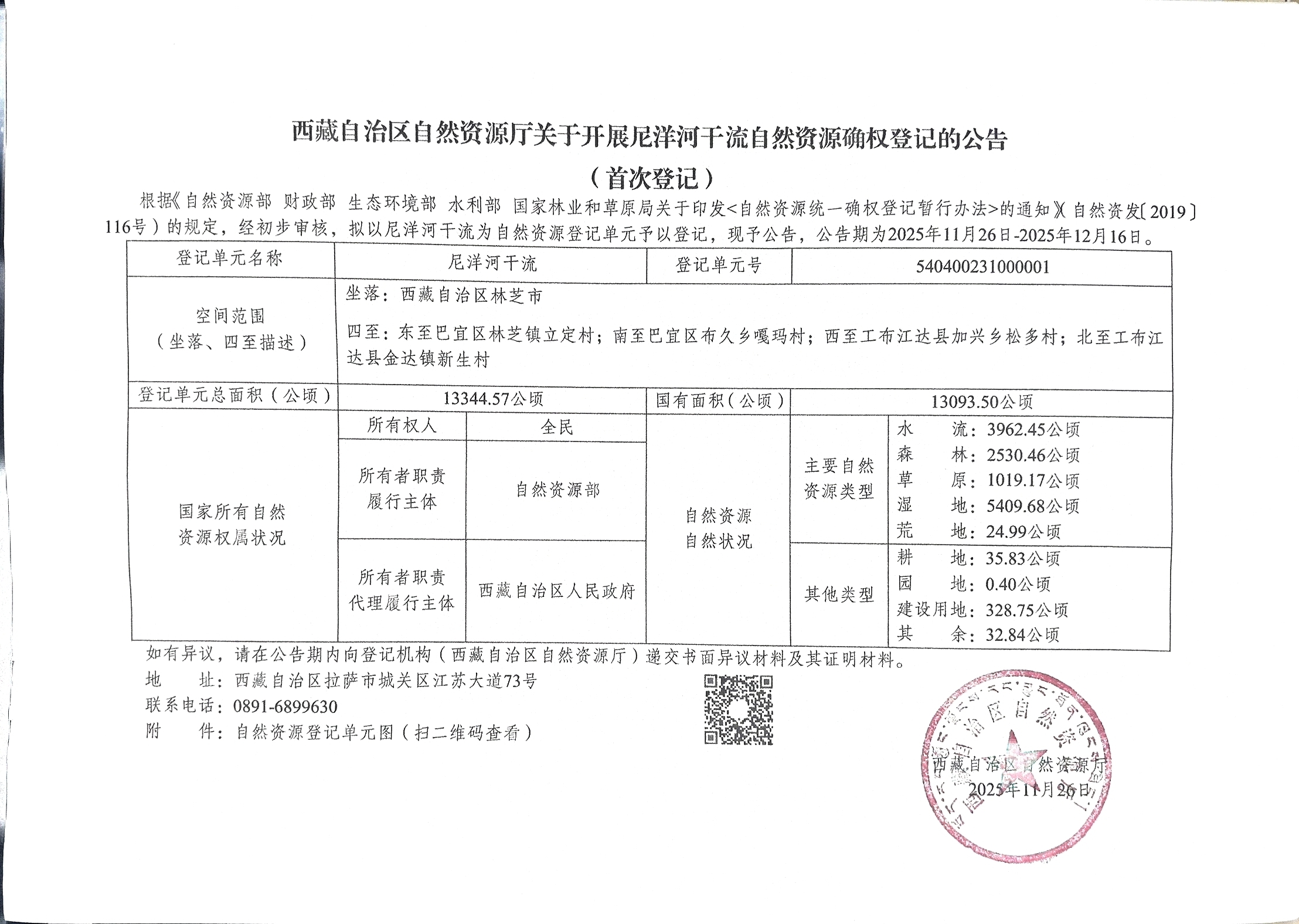 西藏自治区自然资源厅关于开展尼洋河干流自然资源确权登记的公告