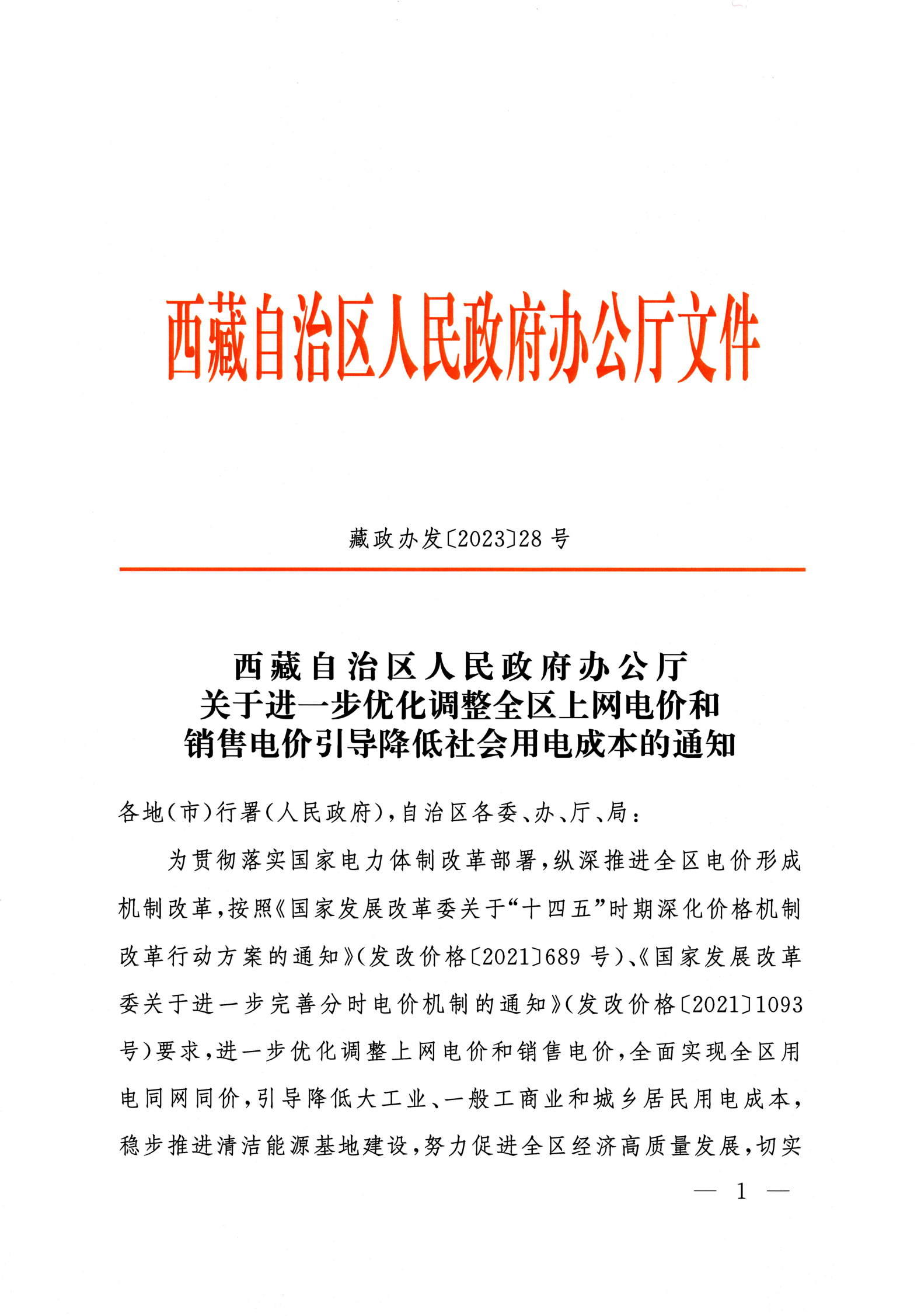 近日,西藏自治区人民政府办公厅印发《关于进一步优化调整全区上网电价和销售电价引导降低社会用电成本的通知》(藏政办发〔2023〕28号),规范调整销售电价类别及标准,其中: